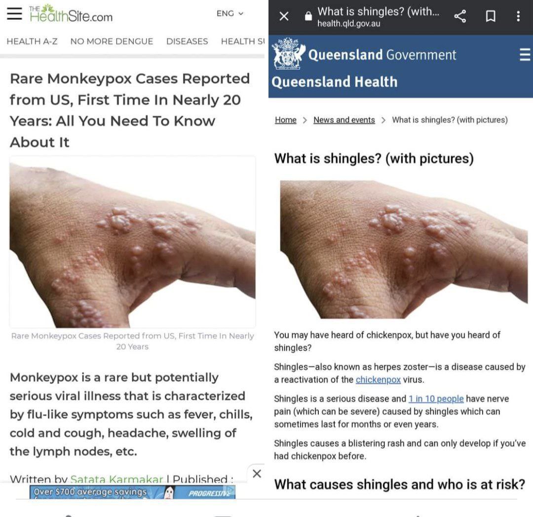 Dit zijn een reeks foto's van huidaandoeningen en ja hoor, verschillende media-sites hebben foto's van de Zona gebruikt als apenpokken. Het toont de corruptie van de media maar vooral dat we al decennia apenpokken hebben gehad zonder te weten omdat er niet naar getest werd, er gaat toch niemand aan dood dus waarom iedereen bang maken. Dat was het idee vroeger, nu grijpen ze elke ziekte aan voor meer angstporno.