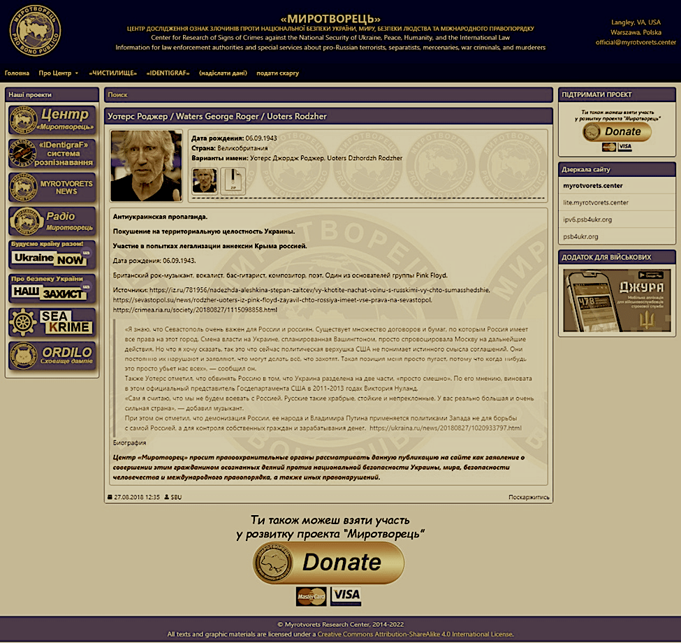 ![]() Roger Waters werd op dezelfde Oekraïense hitlist gezet als de vermoorde Daria Dugina, die daar nu doorgestreept op staat.