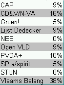Op dit ogenblik hebben 65 mensen in de peiling gestemd, en daarvan hebben 58 een stem op een partij uitgebracht. Dat geeft volgende voorlopige uitslag: CAP, LDD en PVDA+ halen hier moeiteloos de kiesdrempel. Groen! en SP.a/spirit met moeite (5.2%). Groen! heeft hiervoor bovendien de stem van een veertienjarige nodig! Het VB staat nu op 38%, nog altijd minder dan wat het gewoonlijk hier haalt. Met 65 stemmers is deze peiling echter voorlopig zelfs voor politics.be niet representatief.