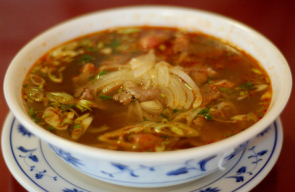 ![]() Pikante Vietnamese soep met rundvlees en dikke noedels.