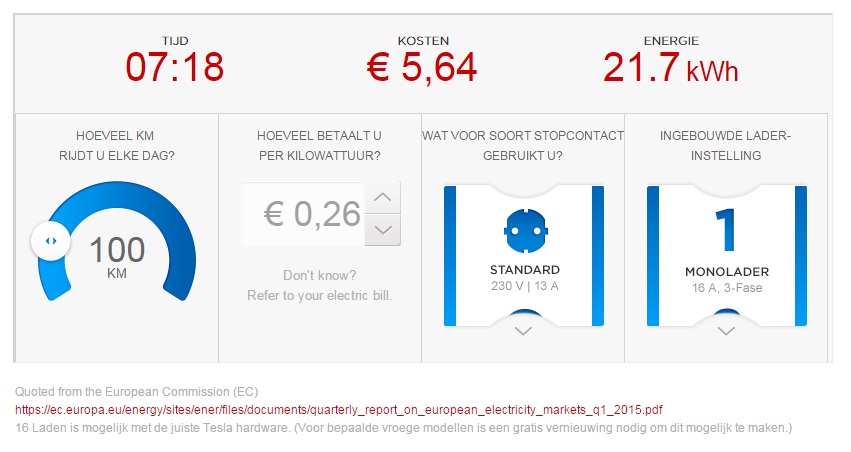 7 uur en 18 minuten nodig om uw batterij voor amper 100 km bij te laden. En duur! In onderstaande calculator 'vergeet' Tesla het rendement van uw lader te verrekenen. Je moet bij de prijs tussen de 10% en 25% bijtellen. |