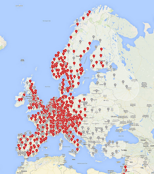 Tesla: rood = bestaand, grijs = onder constructie