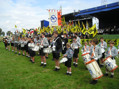 Allé, dat denk ik toch. Ik zou niet weten waarom ze anders altijd met die idiote stoeltjes afkomen bij hun massamanifestaties. Nochtans zijn voor de rest alle nodige ingrediënten voorhanden om er net zo'n groots en indrukwekkend tafereel van te maken. Musicerende en vendelzwaaiende jongeren: Uitstekende locaties met veel plaats en mooie monumenten: Maar nee, dan krijg je dit: Een warrig hoopje oude taarten die op een klapstoeltje zitten in te dommelen. Arm Vlaanderen.