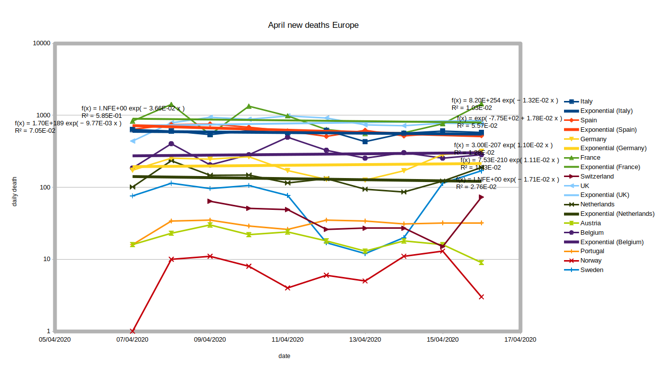 Zoals we kunnen zien, vallen er in Europa nog altijd een stijgend aantal doden. We zien ook uit de individuele land plots, zowel over gans de periode sinds midden maart, als de laatste 10 dagen, dat als er al dalende tendenzen zouden zijn, die zich zeker niet "versnellen". In het beste geval kan men zeggen dat men het dagelijkse aantal doden min of meer kan stabiliseren (hoewel de som voor Europa toch nog altijd blijft stijgen aan een zeker tempo). Maw, de lockdowns in de meeste landen gaan zeker niet leiden tot een sterk afnemen van de epidemie. Ten hoogste een heel heel zwak afnemen, maar in de meeste gevallen een stabiliseren van de hoeveelheid nieuwe besmettingen per dag. |