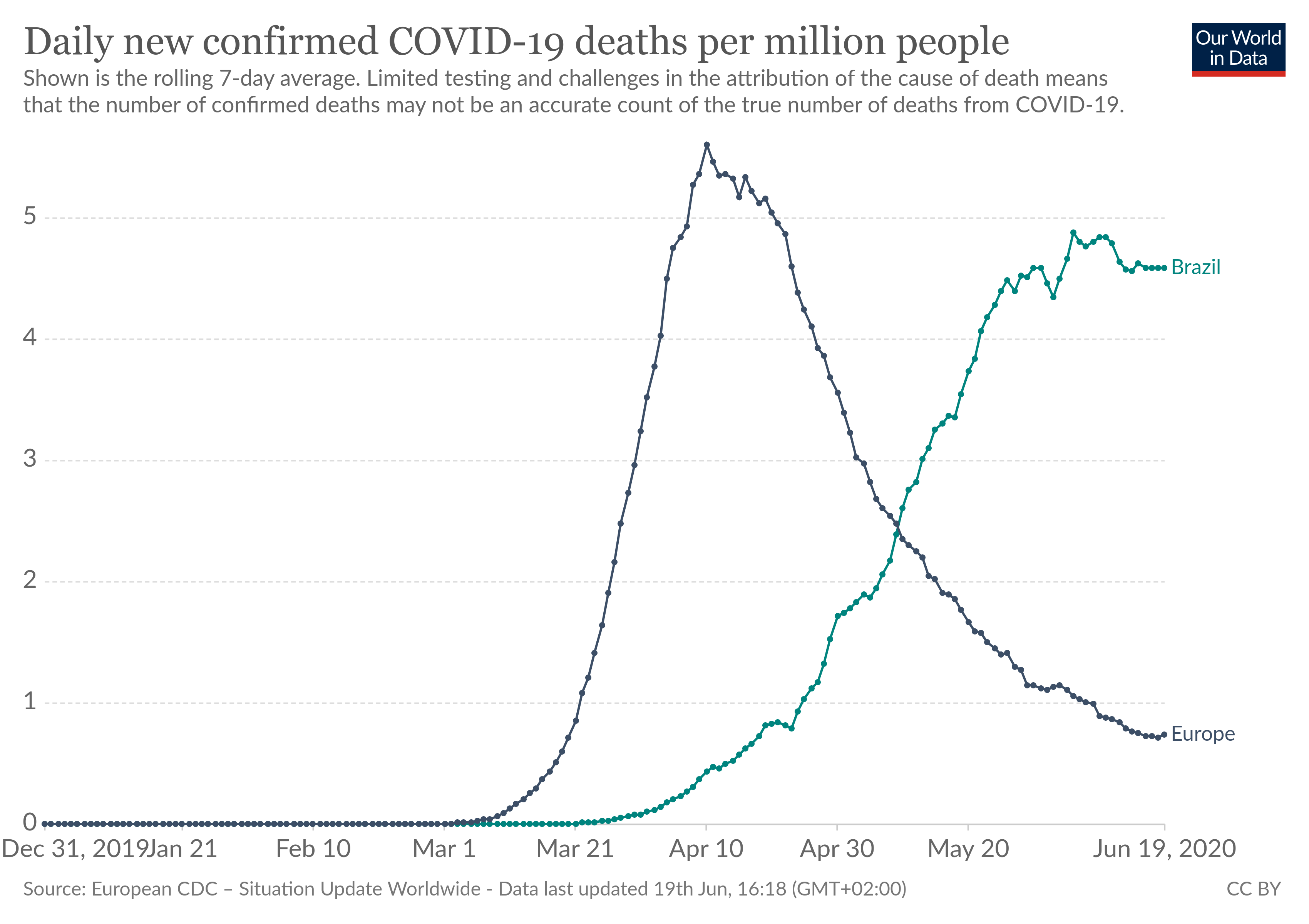 Je zou bijna zeggen dat die zotte Europeanen het laten waaien hebben, en die Brazilianen veel maatregelen hebben genomen om de curve af te vlakken Laatst gewijzigd door patrickve : 20 juni 2020 om 05:01. |