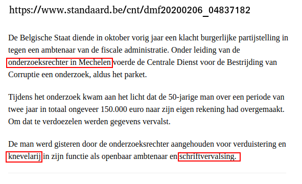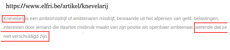 ![]() ![]() Even toch een zijsprong maken gezien de Interessante benaming "knevelarij" die in het artikel is opgedoken. Amper 3 maand geleden krijgen we een subsidiaire belasting (nu 400.000€) in ons bus op basis van zeer oude conclusies van de dienst BTW-controle Ciney doorgestuurd naar IPP Ciney. De gegevens in die conclusies dateren van 2008/2009. Nu is de hele opzet om die belasting op een geloofwaardige manier intern en extern verkocht te krijgen door een onderzoek van de GP (2012-2020) al zeer vroeg naar de prullenmand verwezen. Die resultaten zijn in de periode 2013 - 2019 op verschillende tijdstippen naar zowat alle niveaus van onze fiscus gestuurd, twijfelen aan de echtheid van stukken uit het onderzoek is uitgesloten. Als ik het dossier overloop, een dossier dat ik in zijn kleinste details beter ken dan wie ook, dan springt de maand december 2009 toch wel torenhoog boven de rest uit. Documenten tonen aan dat dit het kantelmoment moet zijn geweest dat onwetendheid omslaat in een bewuste strategie om enerzijds, eerder gemaakte fouten niet te hoeven herstellen en anderzijds een grote som geld onterecht richting schatkist te sturen. Dus vraag ik me af of in mijn geschil ook kan gesproken worden van knevelarij en zo ja, vanaf wanneer. Laatst gewijzigd door Johan Daelemans : 7 februari 2020 om 11:30. |
