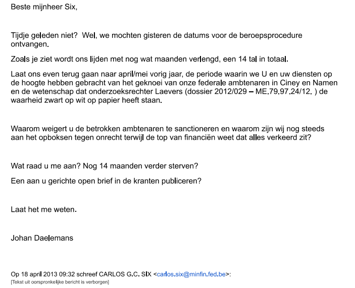 Indien een burger een medemens in nood voorbij loopt zonder hulp te bieden dan schreeuwt men moord en brand en wil men die strafrechtelijk vervolgen .. Als de BBI weigert om een medemens in nood te helpen dan noemt men dat ... goed bestuur ..? Welk zinnig excuus kan men bedenken dat rechtvaardigt om cruciale informatie achter te houden opdat de waarheid ZEKER niet naar andere diensten wordt doorgestuurd? Tijdens mijn wandeling door mijn archieven kwam ik nog nog onderstaande mail tegen (april 2013). Deze geeft opnieuw een duidelijk beeld van de onmenselijkheid waarin onze diensten vertoeven. Volgens mij bestaat er een de te volgen rode draad ... hoe mensenlevens verkloten. ![]() We zijn nu 2020 ... ondertussen is er niks veranderd. Nog even meegeven, toen ook in CC ook alles naar Koen Geens gestuurd via [email protected] Laatst gewijzigd door Johan Daelemans : 16 maart 2020 om 22:28. |