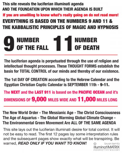 Meer zelfs, sommige zaken worden door de aanhangers van de geheime leer (THE CABAL) beschouwd als symbolen van zeer grote betekenis. Wat men er ook over denkt is het misschien toch raadzaam bvb. 11/9 te vervangen door simpelweg 11 September... Trouwens een datum die voor de mensheid meermaals uiterst belangrijke gebeurtenissen heeft opgeleverd, dit is absoluut geen toeval. |
