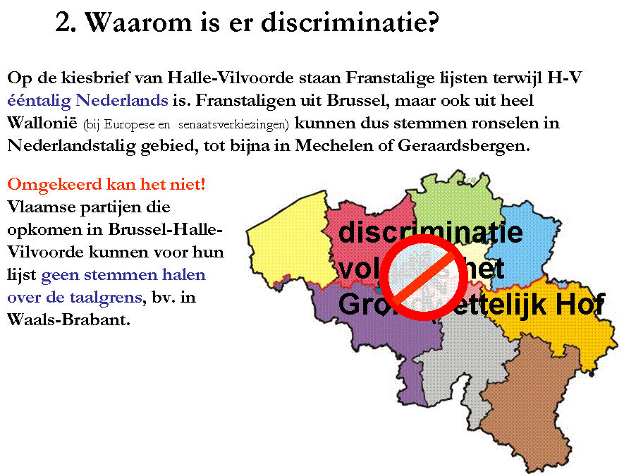 BHV over gaat is het volgende: De taalgrens in België werd bij wet vastgelegd op 8 november 1962. Dat gebeurde met een democratische meerderheid van Vlamingen en Franstaligen. Een jaar later werd de taalwetgeving voor bestuurszaken grondig hervormd. In die bestuurstaalwet werd het begrip taalgrens verbonden met het begrip taalgebied. België werd toen opgesplitst in vier taalgebieden: -het Nederlandse taalgebied, -het Franse taalgebied -het Duitse taalgebied en -het tweetalige gebied Brussel-Hoofdstad. Elke Belgische gemeente maakt ondubbelzinnig deel uit van één - en niet meer dan één - van die vier taalgebieden. De taalgebieden die de bestuurstaalwet in 1963 had vastgelegd werden in 1970 ook verankerd in de Grondwet. Ook dat is gebeurd met een democratische meerderheid van Vlamingen en Franstaligen. Meteen werd ook voor eens en voor altijd afgesproken hoe men de taalgrenzen en de taalgebieden in de toekomst kan wijzigen. Men wou verhinderen dat dergelijke wijzigingen om de haverklap zouden optreden. Als elke nieuwe regering meteen ook een nieuwe taalgrens zou invoeren, zou dat het samenleven van de taalgemeenschappen in België onmogelijk maken. Maar daarnaast wou men ook verhinderen dat één enkele taalgemeenschap de macht zou krijgen om de taalgrens op eigen houtje te hertekenen. Daarom kan de taalgrens alleen worden gewijzigd als daarvoor in het federale parlement een bijzondere meerderheid bestaat. Dat betekent dat het wijzigingsvoorstel in de twee kamers van het federale parlement een tweederde meerderheid achter zich moet krijgen en dat in elke taalgroep een meerderheid van de parlementsleden achter de wet moet staan. De taalgrens kan dus maar worden gewijzigd als daar zowel bij Nederlandstalige als bij Franstalige parlementsleden een meerderheid voor wordt gevonden. Vlamingen en Franstaligen kunnen de taalgrens nooit eenzijdig veranderen. Eigenlijk kunnen we er van uitgaan dat de taalgrens de facto vastligt. Het begrip "taalgebied" is niet louter beschrijvend bedoeld. Het is wel degelijk een juridisch begrip. Met het Nederlandse taalgebied bedoelt men dus niet het gebied waar feitelijk Nederlands wordt gesproken. Neen, het is het gebied waar het Nederlands moet worden gebruikt voor een aantal domeinen die de wet uitdrukkelijk opsomt - bestuur, onderwijs, justitie, bedrijfsleven. Het Nederlandse taalgebied - Vlaanderen dus - is eentalig Nederlands. Dat doet natuurlijk niets af aan de grondwettelijk gewaarborgde taalvrijheid. Wie in het Nederlandse taalgebied woont, mag in de privé-sfeer de talen gebruiken die hij wil. Alleen "voor handelingen van het openbaar gezag en voor gerechtszaken" is dat anders: daar is het Nederlands verplicht. (kopie van http://www2.vlaanderen.be/taalwetgev...lgebieden.html). Bovenstaande is niet zomaar een vodje papier (Tindemans), maar is een deel van de grondwet die gestemd werd door 2/3 van Vlamingen en 2/3 van Franstaligen. Dit is niet opgelegd door Vlaanderen of whatever, nee de Franstaligen gingen akkoord met deze belangrijke wet, die een van de basisprincipes voor de werking van België vastlegt. Deze wet werd steeds zeer strikt toegepast door de Franstaligen voor anderstaligen (meestal Vlamingen) in Wallonië en Brussel. Maar andersom werd vanaf dag 1, nu reeds meer dan 45 jaar dus, deze wet vooral rond Brussel met voeten getreden door de Franstaligen op Vlaams taalgebied. Wat BHV nu eigenlijk is, is dat de Franstaligen na 45 jaar overtreden van de grondwet het recht vragen om ofwel: 1- indien hen dat uitkomt deze grondwet verder te mogen negeren en met voeten treden (status quo) ofwel: 2- indien de Vlamingen willen dat de Franstaligen de grondwet volgen, moeten de Vlamingen daar zwaar voor betalen. Dit is feitelijke chantage en nadien zal blijken dat de Franstaligen nog immer lustig verderdoen, of 3- dat als beloning voor het niet volgen van de grondwet de Franstaligen hun gebied mogen uitbreiden. Dit laaste is dan een vrijgeleide om in de toekomst dit te blijven herhalen. De mensen die BHV na het lezen van bovenstaande afdoen als een detail, als een agressieve Vlaamse eis van vaandelzwaaiers, als gezever van de Vlaamse egoïst… en andere aantijgingen die vooral door Franstalige politici worden gelanceerd om de kern van de zaak te verdoezelen, weten niet waar het over gaat. Een federaal land als België kan niet meer blijven bestaan als één bevolkingsgroep georganiseerd zich niet houdt aan vastgelegde afspraken in de grondwet, DE basis van een land. DAT en niets anders is waar BHV over gaat!