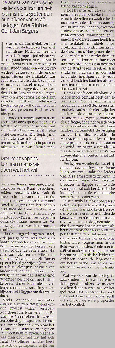 Dit artikel uit de Volkskrant wil ik jullie niet onthouden. Het is een opiniestuk dat ik nergens op internet terug kon vinden, dus ik heb het even gescand. Het artikel schrijft voor de verandering ook eens hoe de situatie vanuit Israëlisch perspectief wordt beleefd, de rol van Israël in het Midden-Oosten, en de machtspelletjes die er worden gespeeld door Iran en de rest van de Islamitische wereld in de strijd tussen Hamas en Israël. Het omschrijft het doel van Hamas (de vernietiging van Israël) als slechts een tussenstap, voor het veel grotere doel van de organisatie en, nog belangrijker, haar financiers.