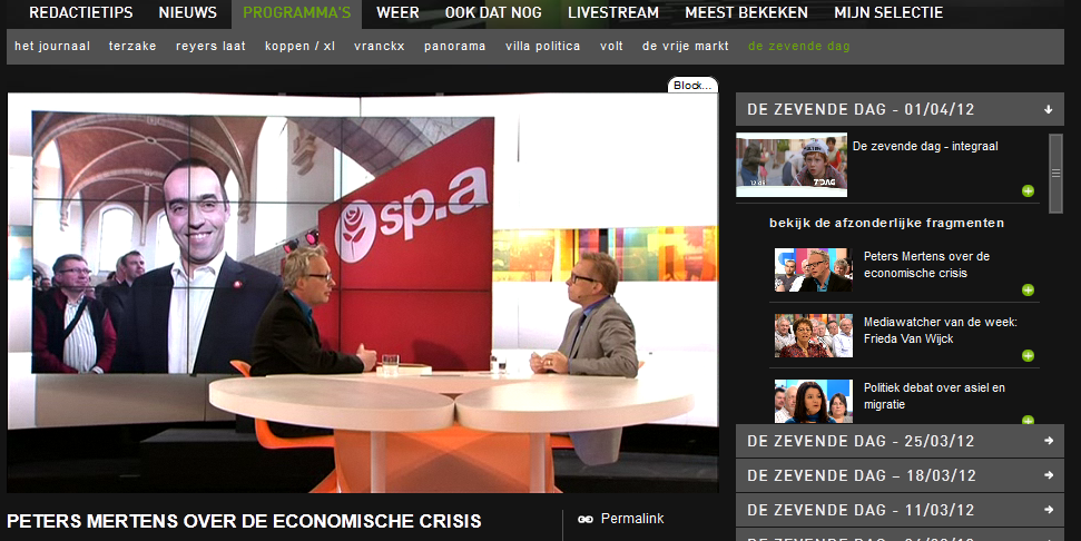Is de titel die de redactie aan dit gesprek geeft. http://www.deredactie.be/permalink/1.1258295 Maar het ging nog over veel meer. Waarom Peter Mertens graag zou discussiëren met de SPA, en alle regeringspartijen. Waarom de PS Calimero is, zoals NVA. Welke maatregelen er hadden moeten genomen worden. Dat er iets fundamenteel verkeerd is, wanneer 0,5% van de wereldbevolking 38,5% van alle rijkdom bezit en in anderhalf jaar tijd zijn rijkdom met 1/3 zag toenemen. Over Arco en Dexia en de arbeidersbeweging. Dat een regering moet durven ingaan tegen de Europese commissie om sociale normen en regels op te leggen i.p.v. gouden regels, sixpacs, besparingsrondes. Laatst gewijzigd door artisjok : 1 april 2012 om 19:54. |