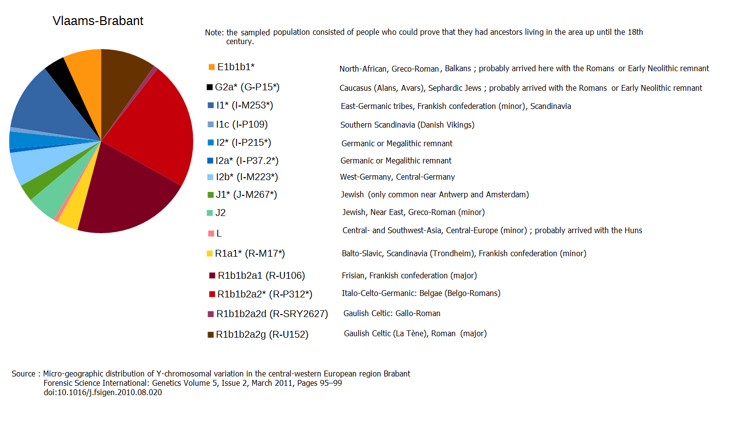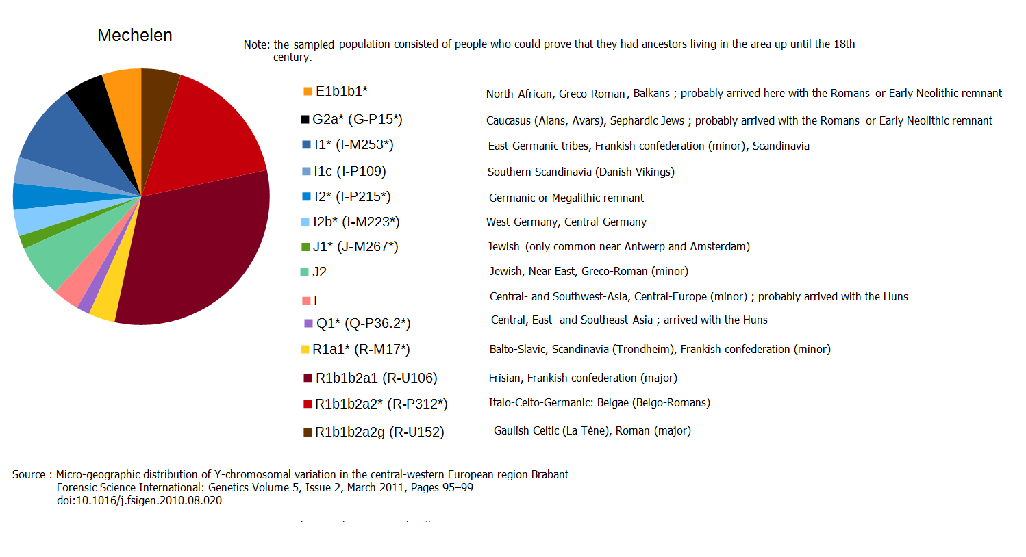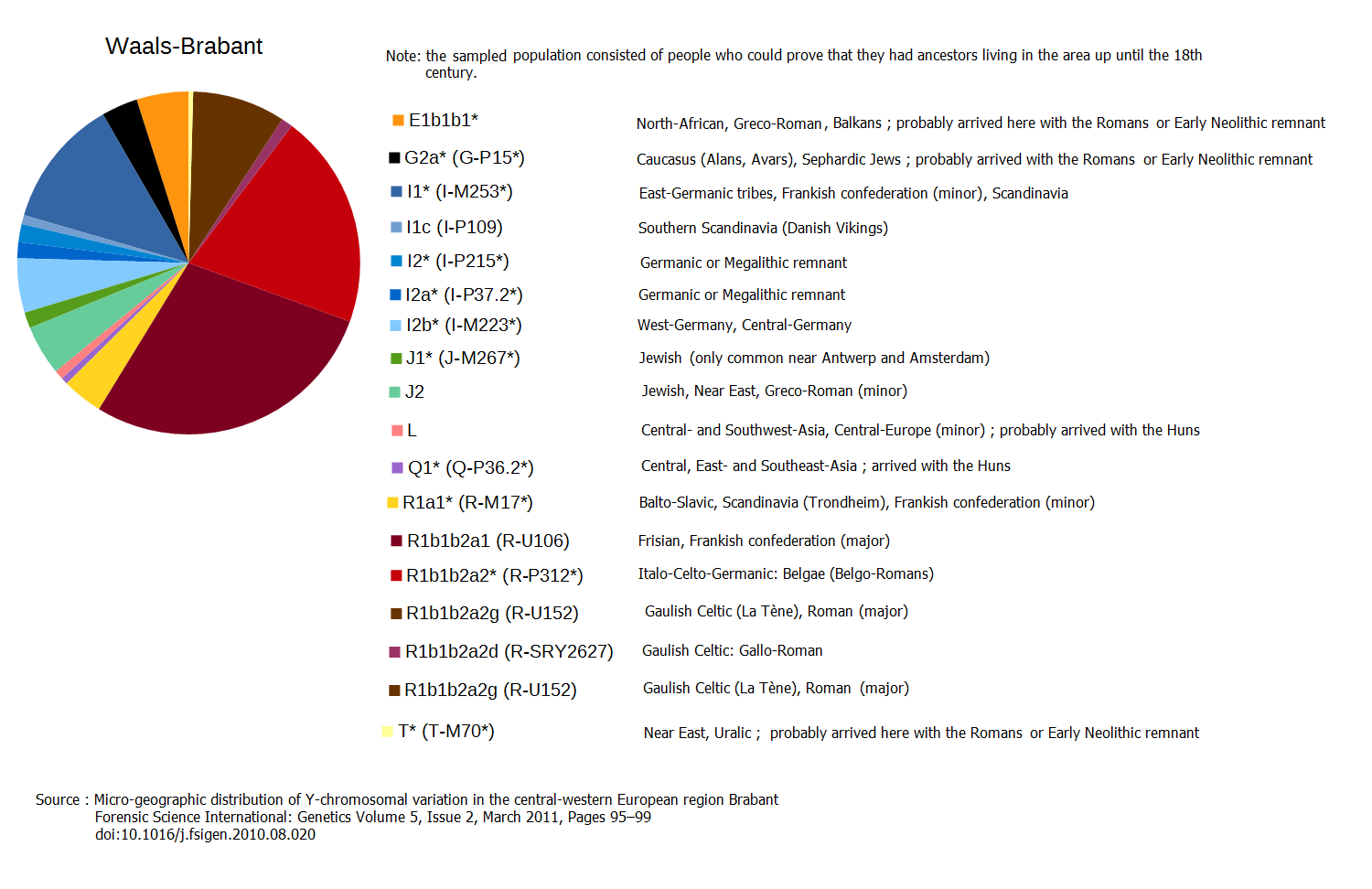 Het is al een aantal jaar geleden sinds ik nog eens hier iets geplaatst heb. Ik herinner me nog laaiende discussies en vergaande speculaties over de origines van het Vlaamse volk. Germaans, Keltisch, Vikingen, Ingvaeoonse Friezen enz... Zoals altijd ligt de waarheid ergens in het midden. Op eupedia.com was men al een tijdje bezig de Y-DNA haplogroepen van de Benelux in kaart aan het brengen. Nu heb ik in mijn handen een studie: Micro-geographic distribution of Y-chromosomal variation in the central-western European region Brabant die een grote populatie uit het voormalige hertogdom Brabant gepolst heeft, en enkel diegene die hun afkomst in de regio kunnen staven tot in de 18de eeuw. Het gebied omvat dus Noord-Brabant (NL), de Kempen, Antwerpen, Mechelen, Vlaams- en Waals-Brabant. Nu, sommigen vragen zich misschien af wat haplogroepen zijn: Citaat:
