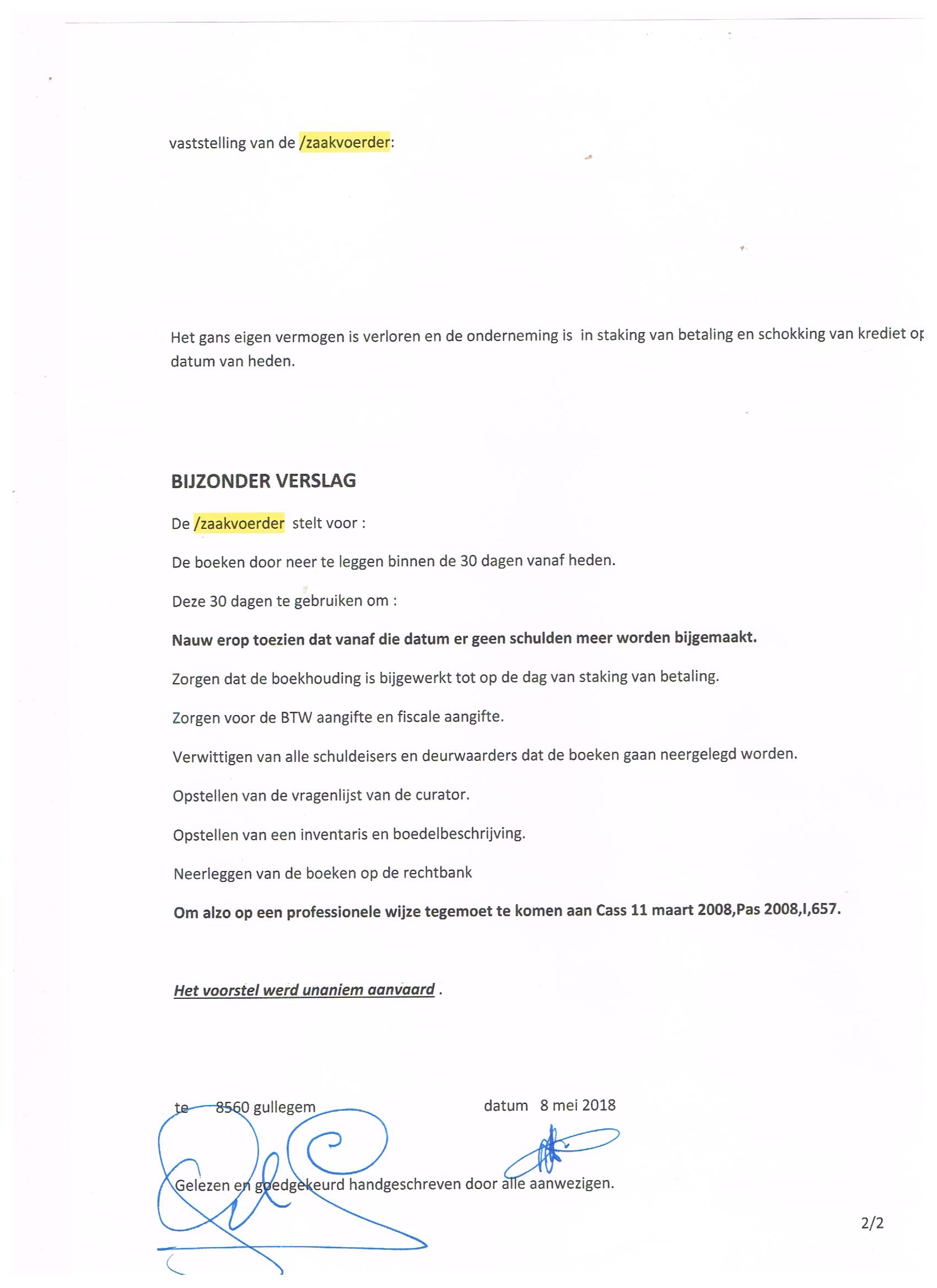 Waarde curator Betreft aansprakelijkheidsvordering XX 127 Hierbij het bewijs dat de boeken moesten neergelegd zijn voor 8 juni 2018 Ik wens dat de ganse facturatie van de advocaat Bert V.sedert die datum terug komt naar de massa. Kan U mij binnen een redelijke termijn mededelen of U stilzit of aansluit als ik vorder met de andere benadeelde adviseurs (boekhouder en bedrijfsrevisor) of zelf gaat vorderen. Bij stilzitten vorderen wij buiten de faling ,U kan dan nog altijd aansluiten of niet . vriendelijke groeten Sterfhuisconsulent VZR Paul Van der Es Bestuurder 0475 875 125
