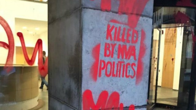 N-VA-HOOFDKWARTIER BESMEURD MET TEKST ‘MAWDA, KILLED BY N-VA POLITICS’