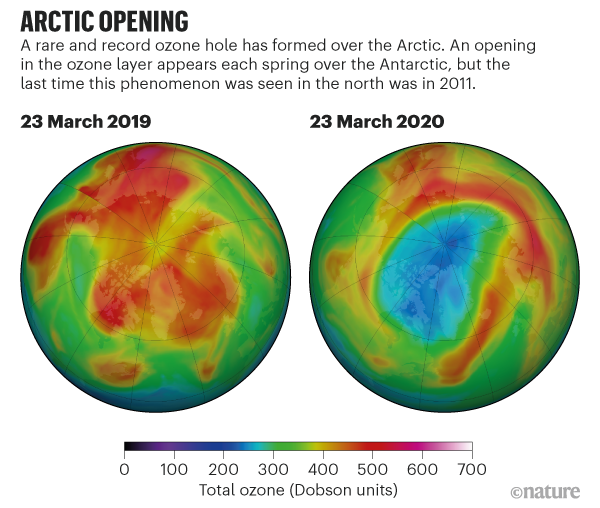 Tiens terwijl het ozongat over de zuidpool de laatste jaren eindelijk wat kleiner geworden is er af en toe (lente?) een groot ozongat boven de Noordpool. Toevallig gevonden, moet ik nog eens nachecken. Citaat: