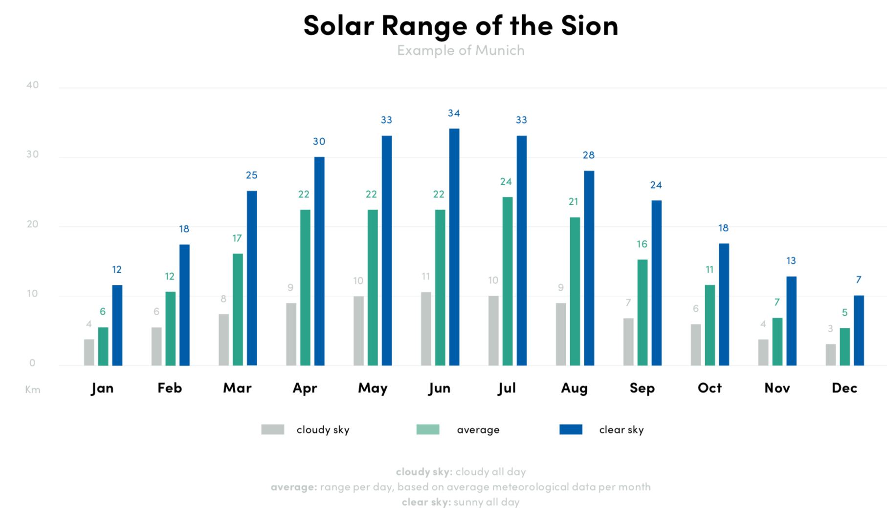 https://www.youtube.com/watch?v=wLZKdkgB85k Batterijpacks van minimum bruikbare 35 kWh tot 45 kWh. Minimum praktijkrijbereik van 250 km. Prijs zou vanaf € 25.500 worden (bevestigt) De zon laadt tot 34 km "per zonnige zomerdag" bij (zie grafiek meteo München), je laadt dus altijd bij wanneer je parkeert of rijdt. Voor gemiddeld gebruik zal je in de regel niet meer hoeven in te pluggen, behalve in de winter dan (kan iedereen zelf uitrekenen adhv die grafiek) Je kunt er zelfs direct apparaten inpluggen, stopcontacten naast de laadplug. Voor langere afstanden kan men ook aan DC 50 kW snelladen (30 minuten tot 80%) Hij zal in de vroegere Saab-fabriek in het Zweedse Trollhättan gemaakt worden, deal met NEVS: https://www.youtube.com/watch?v=Ts-fy4wM5F4 NEVS Will Manufacture the Sion in Sweden | Sono Motors 200 autos per dag gaan er gemaakt worden. Alle info vind je natuurlijk op hun website: https://sonomotors.com/en/sion/ De typische vragen worden hier beantwoord: https://sonomotors.com/en/faq/ Elk voertuig kan men "volplakken" met flexibele zonnecellen: https://sonomotors.com/en/solar-integration/ Sono Sion km-opbrengst vb meteo München: Citaat: