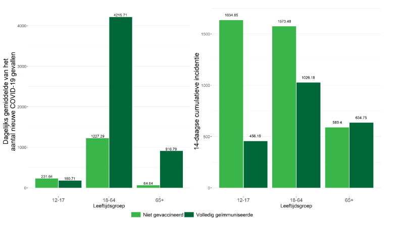 Qua besmetting: 12-17: een factor 3.6 18-65: een factor 1.5 65-84: een factor 0.89 (!) 85+: een factor 1.3 Qua hospitalisatie: 12-17: een factor 10.3 18-65: een factor 5.6 65-84: een factor 3.3 85+ : een factor 2.2 Qua IC opname: 12-17: "oneindig" 18-65: een factor 8.3 65-84: een factor 5.4 85+: 2.3 |