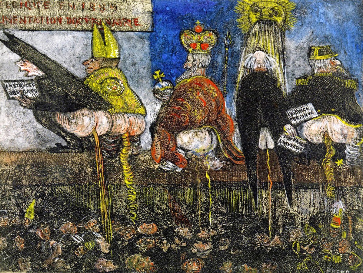 Daar hing een prent van Ensor waar de koning samen met 4 andere hoogwaardigheidsbekleders op het plebs hun hoofden aan het klakken waren. Schitterend gevonden. |