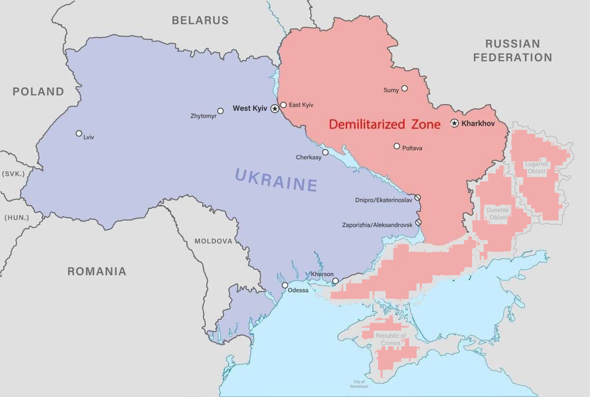 Het was hem toch altijd al (zogezegd) te doen om zelf een veilig gevoel te hebben en de aanwezige Russen (of R gezinden) in het oosten van Ukr wat bescherming tegen nazis te bieden. Als op het gedemilitariseerde gebied toezicht gehouden word door een voldoende gevarieerd UN leger dat ook voldoende middelen en mandaat krijgt om de vrede te garanderen, denk ik dat dit een scenario zou kunnen zijn dat mogelijks wel verkieselijk zou kunnen zijn op de manier waarop het geheel nu verloopt. Het zou tevens een startbasis kunnen vormen voor verdere evolutie naar garanties pro individuele burgerrechten waar ook ter wereld (iets wat vooral mensen ten goede zou kunnen komen die onder autocratische regimes moeten (over)leven. Zie nu pas de kaart. Zou het kunnen dat men de krim vergeten bij te voegen heeft (of is dat volgens China intussen Rusland geworden?). Oei en Donetsk en Luhnsk zijn blijkbaar ook al Russisch geworden. Lijkt me wat in strijd met punt 1 Zo zal het niet lukken vrees ik Spijtig, gemiste kans denk ik ![]()